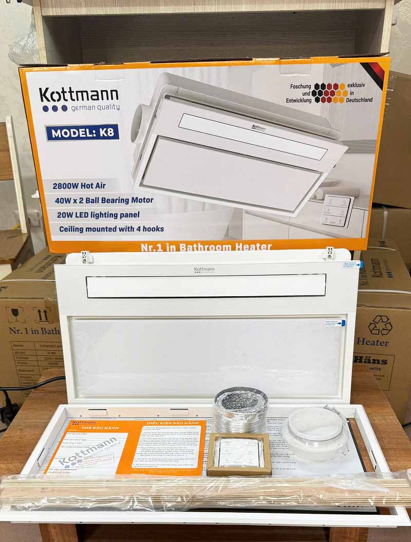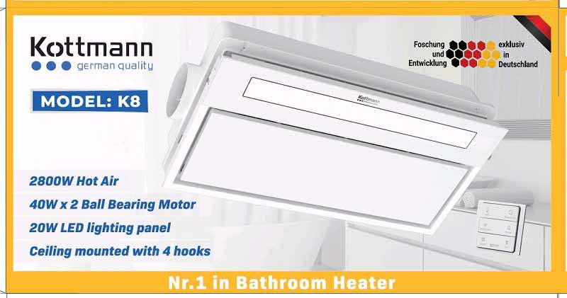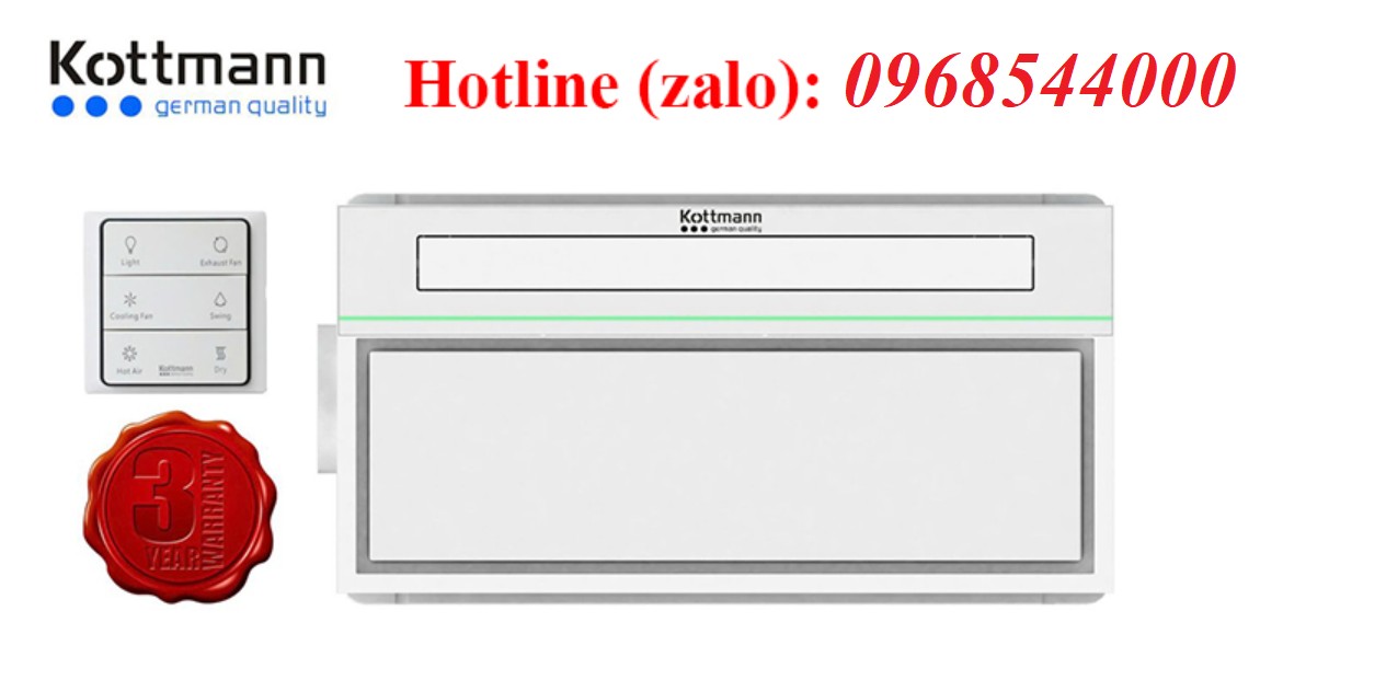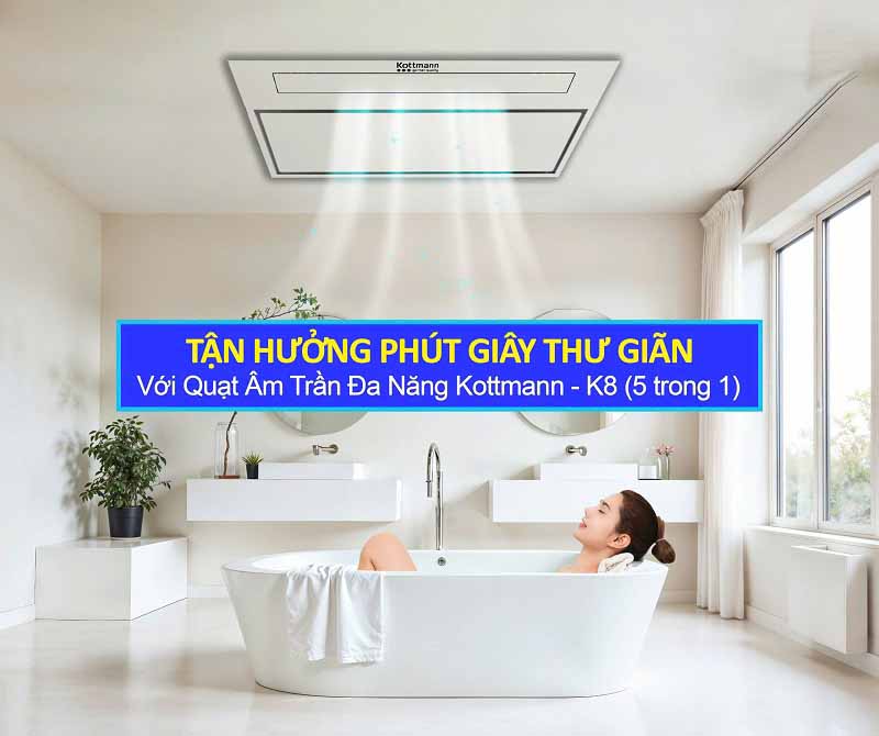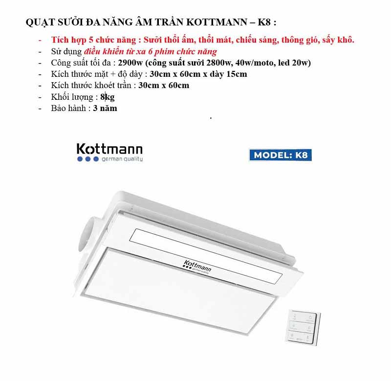 Quạt âm trần đa năng Kottmann K8 – 5 chức năng, Sưởi ấm, thổi mát, hút mùi, chiếu sáng, sấy khô. Thiết kế âm trần sang trọng, công suất 2900W, bảo hành 3 năm.