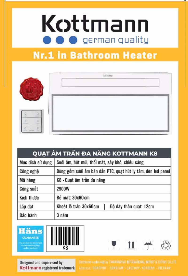 Quạt Sưởi Âm Trần Kottmann K8 là thương hiệu nổi tiếng đến từ Đức, chuyên về các thiết bị sưởi và làm mát chất lượng cao. Với công nghệ hiện đại, sản phẩm Kottmann K8 mang đến trải nghiệm tiện nghi và an toàn tuyệt đối cho gia đình bạn.