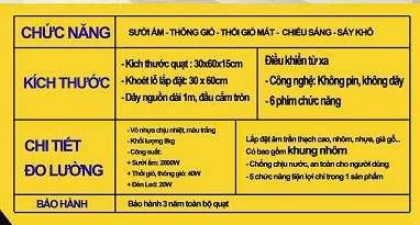 | Công nghệ | Gốm sưởi PTC + Đèn LED + Quạt ly tâm |